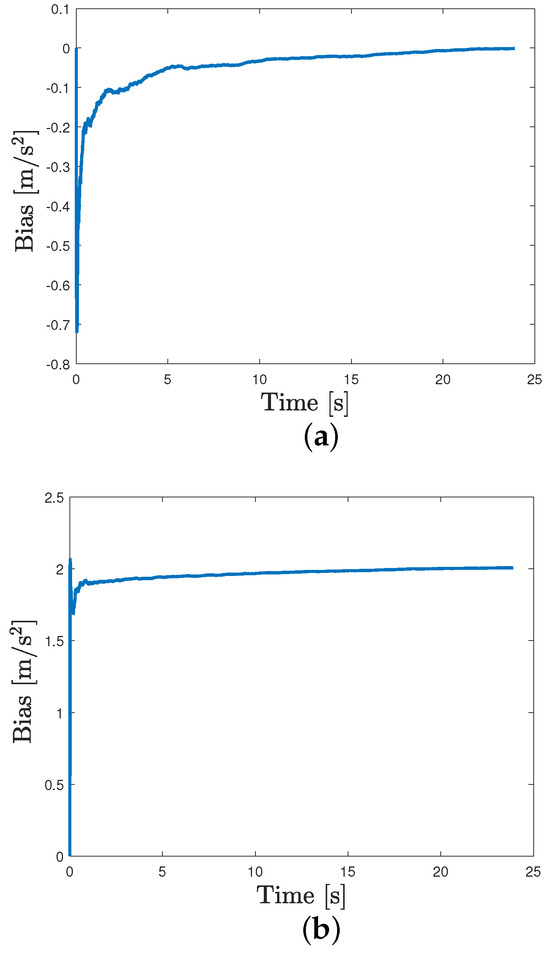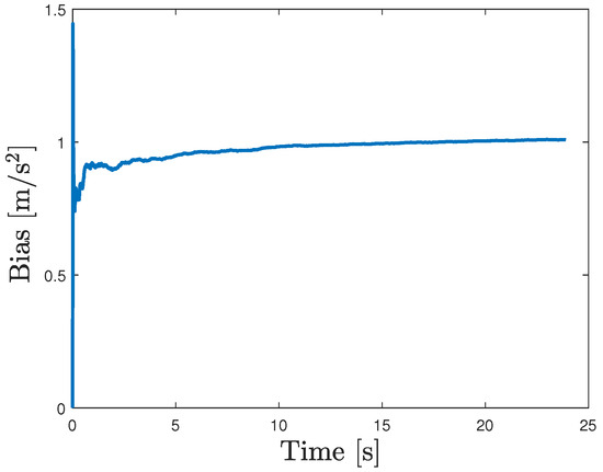 To further assess the accuracy of the estimated average bias, we use the procedure in Section 2.2, i.e., the one in the case where the GNSS signals are not available, using the IMU signals of before and the bias estimated before (the case in which the true bias is equal to 1). The forgetting factor is set as , and the initial conditions as