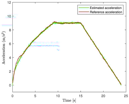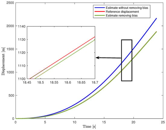 Moreover, we set . Figure 6 shows that the estimated acceleration on the Y-axis. We notice that the estimate is very accurate. Figure 7 shows the displacement along the Y-axis in the case where the average bias is removed (i.e., our procedure), green line, and not removed, blue line. We observe that our estimate is very accurate. Conversely, if we neglect the influence of the average bias in accelerometer measurements and directly apply the raw acceleration, then, the resulting deviation is significant.
