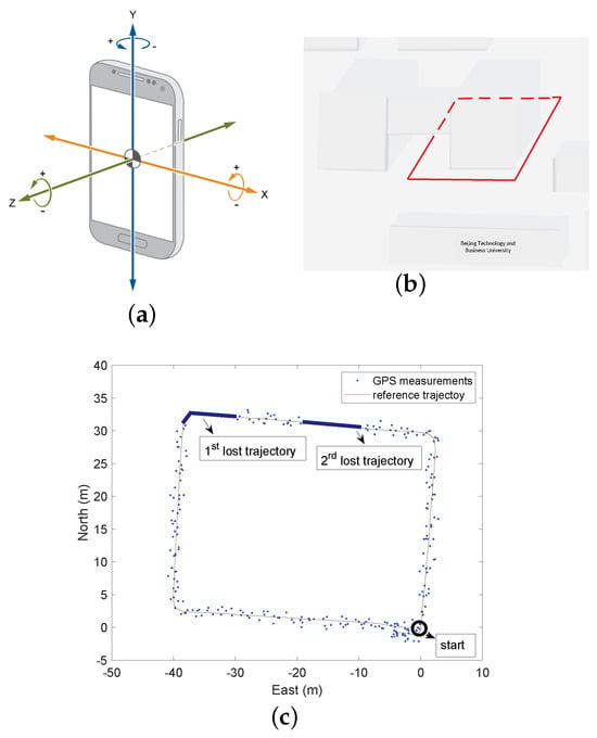 Description of the experiment. (a) Axis orientation of the smartphone. (b) The pre-planned path. Dashed style means that the pedestrian is walking on an underpass. (c) The reference trajectory and GNSS measurements in the ENU-system. The pedestrian started at the black circle, moving clockwise, following the red path.