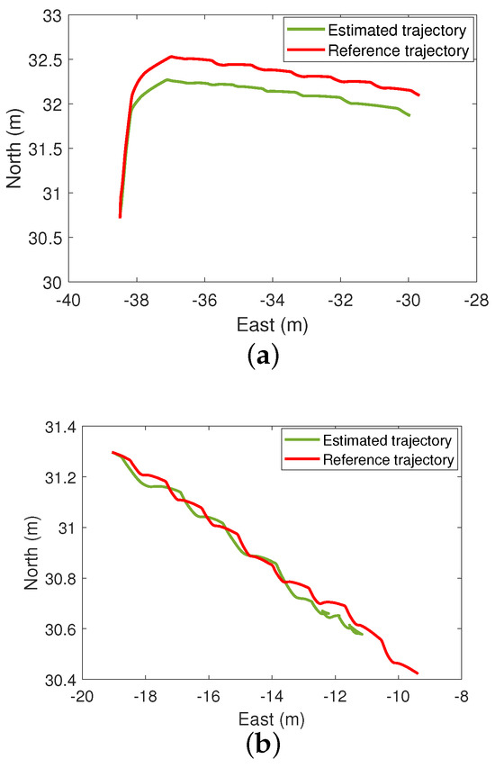 Position estimation in the ENU-system in the GNSS-denied environment. (a) Estimated position in the first GNSS-denied trajectory. (b) Estimated position in the second GNSS-denied trajectory.