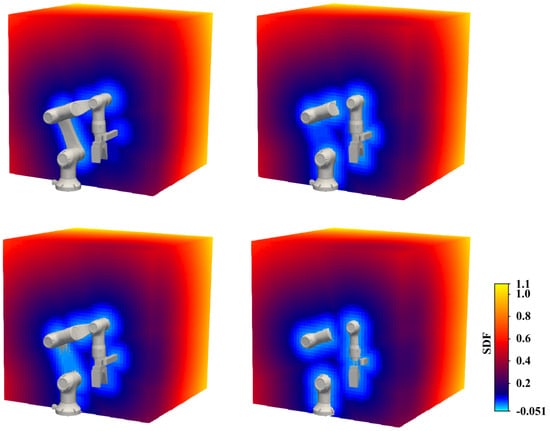 In terms of an implicit SDF model for representing the robotic arm, Boyuan Chen et al. [] proposed a body self-modeling approach based on SDF for robot morphology representation. Specifically, they used a single implicit neural network to answer space occupancy queries given the current posture or the possible further states of the robot. Mikhail Koptev et al. [] proposed the Neural-JSDF, which is a neural joint space implicit SDF for a given robot, and extended its application to a quadratic program inverse kinematics solver and sampling-based model predictive controller. Yiming Li et al. [] employed a combination of Bernstein polynomials to encode the signed distance for each robot link and leverage the kinematic chain to produce the SDF representation in joint space. Mark Nicholas Finean et al. [] explored the use of composite SDF in motion planning and how they can be used in predicting obstacle motions. Puze Liu et al. [] proposed the regularized deep SDF that can compute a smooth distance field at any scale and verified its effectiveness in human–robot interaction experiments. Ming-Hsiu Lee and Jing-Sin Liu [] constructed an SDF to describe the swept volume of obstacles to identify the safe protective space for operation.