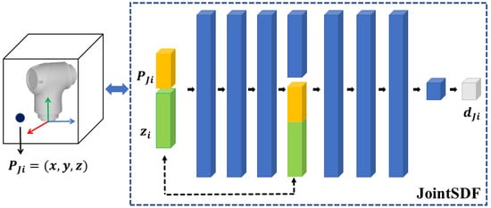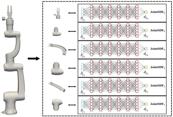 Although it is feasible to represent robotic morphology implicitly using an SDF neural network, with inputs comprising the point coordinates and joint angles and output yielding the corresponding SDF value, it is notable that the accuracy of the robotic model, which is reconstructed by the network, tends to be compromised, particularly in regions near joint links []. In this paper, we segment the robot model into several independent joint links and leverage implicit neural representation, which is regarded as the JointSDF, to model each joint link, as shown in Figure 2. Specially, to facilitate practical application, the gripper and the end joint are treated as one in this paper, since they are usually fixed together.