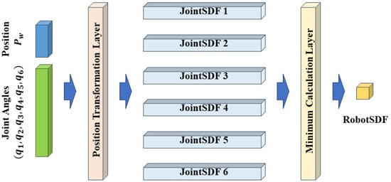We further format the calculation procedure of RobotSDF in the network structure, as shown in Figure 5, which consists of the input layer, position transformation layer, JointSDF layer, minimum calculation layer, and the output layer. By vectorizing the network input, the network can simultaneously calculate RobotSDF values for multiple query points, greatly improving the computing efficiency in practical applications.