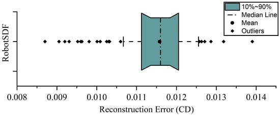 Figure 8 depicts the distribution of CD in a box plot, which reveals a mean CD of  and a median CD of . For  of the samples, the CD error falls within a narrow range, specifically between  and , indicating a consistent level of approximation across the sampled postures. Among all samples, the maximum CD error is , and the minimum CD error is .