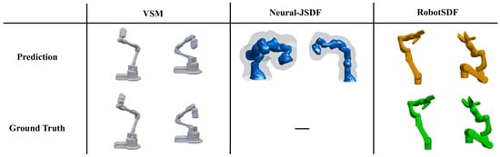 The comparison of robot morphology expression capabilities among three algorithms (VSM, Neural-JSDF, and RobotSDF). The pictures of VSM [] and Neural-JSDF [] are from corresponding papers. Since the ground truth picture of the Neural-JSDF is not given in their paper, only the prediction result is given here. The proposed RobotSDF shows the smoothest and most detailed robot surface.