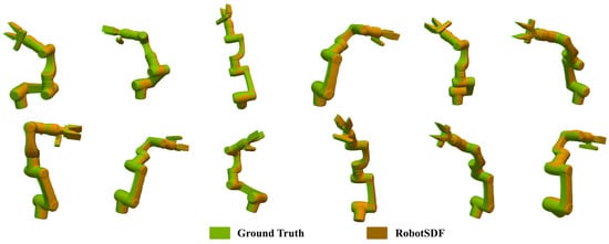 Table 2 presents a comparative analysis of the average RMSE between the proposed RobotSDF and Neural-JSDF proposed by Mikhail Koptev et al. [] and the configuration space distance field (CDF) []. Neural-JSDF is employed to construct an SDF model of the Franka Emika Panda robot, yielding an average RMSE of 10.40 mm and a standard deviation of 7.80 mm for all joints. Compared to Neural-JSDF, the proposed RobotSDF demonstrates an improved performance, with an average RMSE of 6.38 mm and a standard deviation of 4.62 mm. This represents a  reduction in average error compared to Neural-JSDF. Additionally, even the joint with the highest RMSE in the RobotSDF exhibits a  lower error than Neural-JSDF. Similarly, when representing the morphology of the Franka robot, the RMSE achieved by CDF reaches 18.90 mm, associated with a standard deviation of 8.00 mm. Compared with CDF, the accuracy of the proposed RobotSDF is improved by .The experimental results show that RobotSDF has higher accuracy in expressing the joint morphology of the robot.