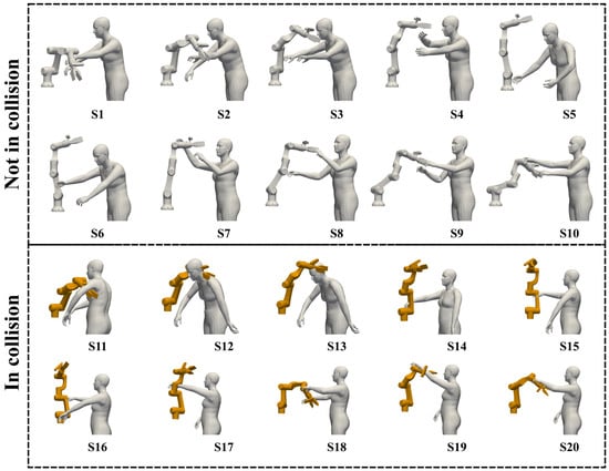 To evaluate the collision detection efficacy of RobotSDF in the task of human–robot collaboration, 20 distinct scenarios were simulated as shown in Figure 11, and the corresponding collision detection results were compared with two classic algorithms: the Separating Axis Theorem (SAT) [] and the Gilbert–Johnson–Keerthi (GJK) algorithm []. The human body in the simulation is randomly generated based on the SMPL model []. In the first 10 scenarios (S1–S10), the human model does not physically intersect with the robot, and human models intersect with the robot in the last 10 scenarios (S11–S20).