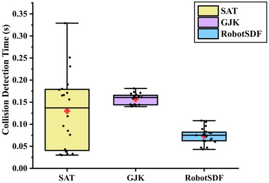 In addition to the collision detection accuracy, the collision detection efficiency of RobotSDF was compared with GJK and SAT as well, as shown in Figure 12. The mean collision detection times for SAT, GJK, and RobotSDF were 0.1299 s, 0.1568 s, and 0.0735 s respectively, and the associated variances were 0.0069 s, 0.0001 s, and 0.0003 s. Overall, RobotSDF exhibits remarkable detection efficiency, capable of detection at the centisecond level, surpassing the performance of SAT and GJK, which achieves detection efficiency at the decisecond level. In terms of detection stability, RobotSDF and GJK perform similarly with small variances, and a higher variance occurs for the SAT algorithm. That may be because numerous query points can be taken as inputs to the RobotSDF network at the same time, and the detection results can be identified simultaneously. Processing a substantial amount of data concurrently enables RobotSDF’s rapid collision detection ability even in environments with various obstacles. Experimental results demonstrate that RobotSDF can accurately identify collisions in confined environments, including those involving highly irregular shapes such as the human body. This precision is maintained even when the human performs complex postures at a close distance from the robot, highlighting the effectiveness of RobotSDF in collision detection and enhancing the robot’s operational capabilities in restricted spaces.