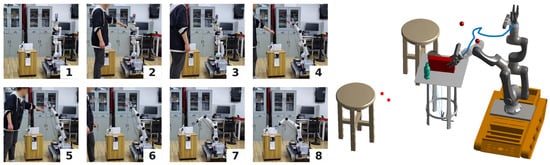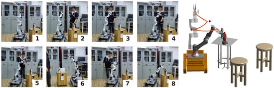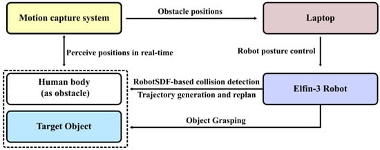 Two human–robot intersection experiments were conducted within the real-world environment to evaluate the practical applicability of RobotSDF. As shown in Figure 13, the experimental system comprises the robot body, a target object placed on a table, a laptop as the control center, a person as the obstacle, and the motion capture system. Markers are affixed to both the target object and the human body, allowing the motion capture system to sense their spatial positions. The motion capture system and the robot are connected to the laptop via the network cable, enabling real-time data interaction. During the experiment, the robot perceives the spatial positions of the human body in real time and checks if they are in collision with the robot. The trajectory of the robot to the target object is first generated based on the Rapidly-exploring Random Tree (RRT) algorithm, and the robot follows accordingly. Then, the system will determine whether the subsequent trajectory will collide with the person; if so, the trajectory will be re-planned until a new collision-free trajectory is built.