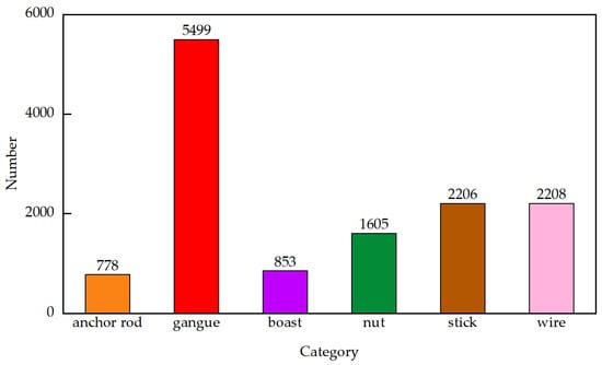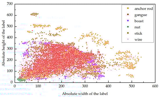 According to Figure 2 and Figure 3, it can be seen that a small number of anchor rods, sticks, gangues, boasts, wires, and all nuts in the occluded case are small targets; some nuts reach the minimum target, accounting for 12.21%. Combined with Table 4 and Table 5, it can be seen that due to occlusion, the actual width and height of most targets are far from the width and height of the 100~400-pixel size shown in Figure 2. The actual visualization area is small, but it is still larger than the visualization area of the nut.