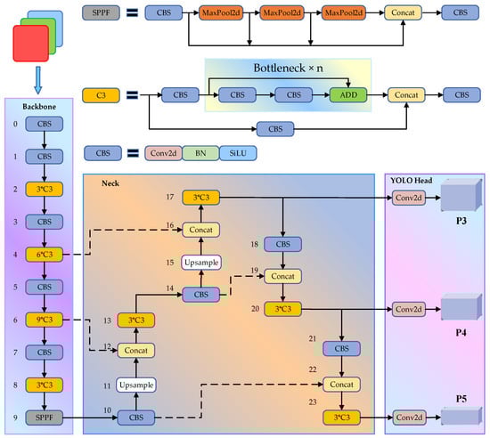 Backbone: The backbone network of YOLOv5s mainly includes the Conv, C3, and SPPF modules, which are used to extract input image features. Conv consists of a convolution layer (Conv2d), a batch normalization layer (BN), and a SiLU activation function. The convolution layer is used to extract local spatial information, the normalization layer is used to normalize feature distribution, and the activation function is used to achieve nonlinear mapping. C3 consists of three standard convolutions and multiple bottleneck structures (Bottleneck), which are used to increase the depth and receptive field of the network and improve feature extraction capability. The SPPF passes the input through multiple maximum pooling layers (MaxPool) with different kernel sizes in parallel, and then concatenation (Concat) is performed to fuse different features, which solves the multi–scale issue of detected targets.