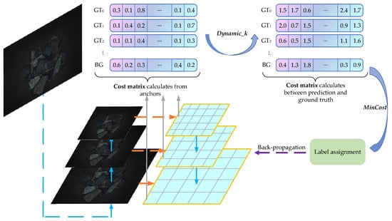 After obtaining the cost matrix , it is necessary to determine the number dynamic_k of positive samples for each GT. The calculation method for the dynamic_k value consists of calculating the IoU between the current GT and all prediction boxes generated by the Anchor, selecting the top 10 largest samples, and then rounding down the sum of the 10 IoU values, which is the dynamic_k; the minimum number of positive samples is guaranteed to be 1. After obtaining the positive samples, the cost matrix is traversed, and the first dynamic_k samples with the smallest loss for each GT are taken as positive samples. Finally, the situation where one prediction frame is assigned to multiple GTs is eliminated, and the division of positive and negative samples is completed. A logic diagram of the SimOTA algorithm is shown in Figure 5.