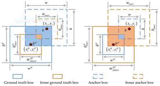 where and are the intersection and union of the auxiliary bounding box of the target ground truth box (Inner ground truth box) and the auxiliary bounding box of the anchor box (Inner anchor box), , , , , and , , , and are the horizontal and vertical coordinates of the left, right, upper, and lower sides of the Inner ground truth box and Inner anchor box. (), , , and (), , and are the midpoint coordinates, width, and height of the GT and Anchor. The is the scale factor that controls the width and height of the auxiliary bounding box, and its value range is [0.5, 1.5]. When , the auxiliary bounding box is shown on the left side of Figure 4. When , the auxiliary bounding box is shown on the right side of Figure 4. When , the auxiliary bounding box is consistent with the GT and Anchor. When , a better balance can be achieved between the different categories of targets, and the detection effect is the best. The larger auxiliary frame can not only include more information, facilitating the utilization of contextual information, but also reduce error fluctuations caused by pixel deviation and improve model detection accuracy.
