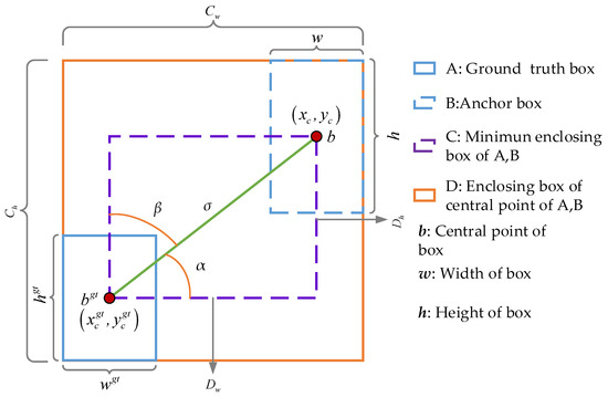where and are the horizontal and vertical distances between the centers of GT and Anchor, and are the width and height of the minimum external rectangular frame of GT and Anchor, is the angle cost, and its value range is [0, 1]; and are the angles between the line connecting the center point of GT and Anchor and the horizontal axis and plumb axis, and is the distance between GT and the Anchor center point.