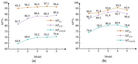 The mean Average Precision (mAP) with IOU thresholds of 0.5, 0.75, and 0.5:0.95 is used to evaluate the detection accuracy of the model, which is recorded as mAP0.5, mAP0.75, and mAP0.5:0.95, respectively. The model complexity is evaluated by parameters, the model size, and floating point operations per second (FLOPs). The detection speed is measured by frames per second (FPS). The ratio of the number of parameters before and after model pruning is used to measure the model compression degree. The calculation of the mAP is as follows.