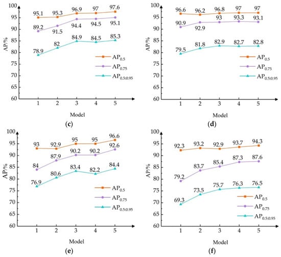 It can be seen from Figure 9 that the AP0.5, AP0.75, and AP0.5:0.95 of the six categories of targets are generally rising. The AP0.5 polylines of nuts, gangues, and wires are relatively flat, and the changes in the remaining targets are obvious. Aside from the fact that the polylines of the AP0.75 and AP0.5:0.95 of gangues are relatively flat, the AP0.75 and AP0.5:0.95 of other targets are greatly improved. Compared to AP0.75 and AP0.5:0.95, AP0.5 has lower positioning accuracy requirements. When the overlap between the prediction frame and real frame reaches 50%, the target is considered to be detected. The same prediction frame is more likely to be judged as the correct detection frame. The more frames that the model determines to be correctly detected, the higher the AP is, but the corresponding AP0.5 improvement is limited. On the basis of Model 1, Soft–NMS is used. The AP0.75 and AP0.5:0.95 of the six categories of targets change greatly; the increases are above 2% and 2.3%, respectively. Among these, the AP0.75 and AP0.5:0.95 of the nuts increase by 4.8% and 3.6%, which verifies that Soft–NMS has a significant effect on dealing with small and occluded targets. Then, SimOTA is changed in Model 2. The AP0.75 and AP0.5:0.95 of the gangues have the smallest increase, but the stick has the largest increase; both indicators increase by 2.9%. The increases in the remaining targets are still large, which verifies the strength of SimOTA in dealing with small and occluded targets. After adding Slide Loss to Model 3, the improvements in the six categories of targets increase and decrease, but only the nuts are decreased by 0.3% on AP0.5, and the rest are improved, with the highest increase of 2.9%. For AP0.5:0.95, it is mostly decreased, and anchor rods and wires are increased by 0.5% and 0.6%, which still indicates the effectiveness of Slide Loss. Finally, the addition of Inner–SIoU has a negative impact on the detection of anchor rods. Its AP0.5 decreases by 2.3%, and AP0.5:0.95 decreases by 2.1%. However, it has a gain effect on other targets. The gain effect of boasts is the most obvious, reaching 2.4% and 2.2%. The nuts also have an increase of 1.1% and 0.6%, which proves that Inner–SIoU can deal with different scale and shape targets.