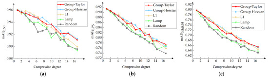 In order to more objectively show the difference in the detection accuracy of five pruning methods under different compression degrees, a line chart of mAP0.5, mAP0.75, and mAP0.5:0.95 is drawn, as shown in Figure 10. On the mAP0.5 chart, the accuracy values of the Group–Taylor and Group–Hessian methods are significantly better than those of the other three methods, and in particular, when the compression degree is close to 17, the difference is obvious. In the mAP0.75 and mAP0.5:0.95 chart, the accuracy values of the L1, Group–Taylor, and Group–Hessian methods are basically higher than those of the Random and Lamp methods. From the three charts, the Group–Taylor and Group–Hessian pruning methods are better.