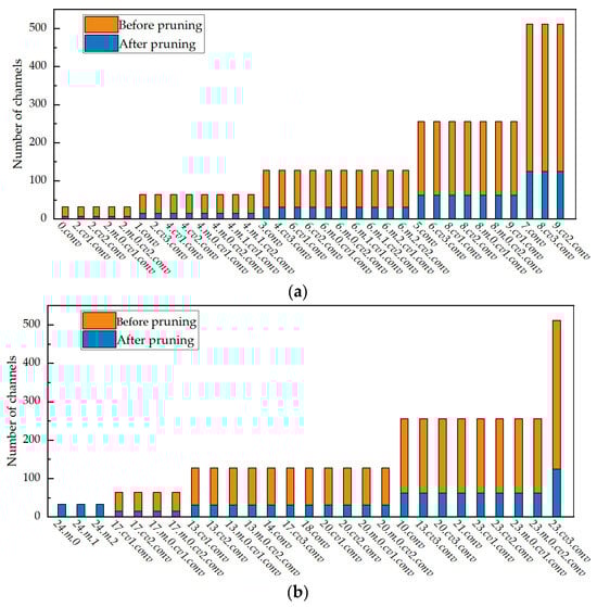 Comparison of number of convolution channels before and after pruning. (a) Backbone; (b) Neck + Head.