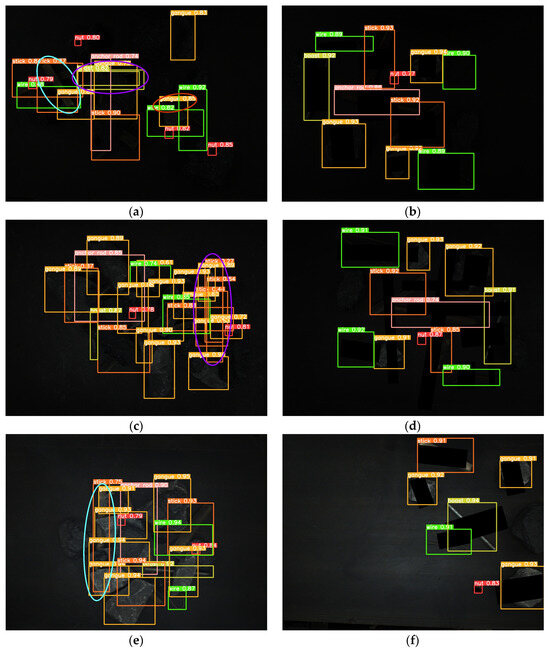 From Figure 12, it can be seen that in the 80-Lux real occluded image (a), due to too low illumination, irregular wires blocked by the gangues have low visibility and a small visual area. In addition, due to the influence of nearby wires, the model misses a wire target. In the middle of the image, because the boast is blocked by the gangue and anchor rod, its contour is unclear, and there are multiple detection times and inaccurate positioning. On the left side of the image, two sticks are crossed, one stick is cut off by the coal and nut, which leads to a big positioning error when the model detects the other sticks, and the prediction frame is obviously larger. In the 185-Lux real occluded image (c), the influence of illumination on the occluded targets is significantly reduced. For the right long stick, it is truncated and occluded, resulting in repeated detection, the positioning error of the prediction box is big, and the confidence of the relatively accurate prediction box is only 0.64. In the 280-Lux real occluded image (e), it can be seen that the long stick on the left side is cut into several sections by gangues. The lower part of the stick is similar to the gangue, and the prediction frame is not positioned accurately. Most of the occluded targets in the real occluded images (a), (c), and (e) are effectively detected. Compared with the real occluded images, most targets in the 80-, 185-, and 280-Lux synthetic images (b), (d), and (f) have better detection results and higher confidence. It can be seen that the low-illumination environment has an impact on the detection of occluded targets, and this impact gradually decreases as the illumination increases.