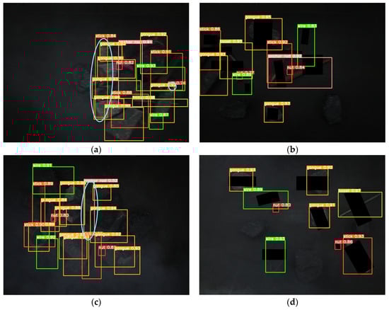 Figure 13a,b were collected at a belt speed of 2 m/s. Subjectively, the overall ambiguity of the image is low, and the impact on large targets is limited. In Figure 13a, the small nut target on the right has low discrimination with the gangue contour, and the detection confidence of the nut is only 0.74, which affects the overall detection effect. Due to the occlusion of multiple pieces of gangues, the long stick on the right side is cut into multiple segments, and the model attention to the boundary is relatively insufficient, resulting in the poor positioning of the stick and obvious excess blanks at the upper end of the prediction frame, which does not contain the target component. The targets in Figure 13b are relatively sparse, and the overall detection effect is good. The dust fog images (c) and (d) were collected under a certain concentration. The concentration of dust fog is limited and has relatively little impact on the targets. The anchor rod in the middle of Figure 13c is obscured by the gangues and dust fog, resulting in unclear boundaries. The prediction frame does not fully include the anchor rod, and the detection effect is poor, with a confidence of only 0.52. The overall detection effect of the targets in Figure 13d is good. It can be seen that the factors such as blur and dust fog increase the difficulty of target detection, but the proposed method effectively detects most targets.