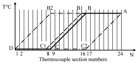 At the second stage, we calculate the deviation of the CF of chromel and alumel TC legs from the nominal one after the change in the temperature field from A, B, C, D to A, B1, C1, D, that is, when (the temperatures of the TC sections from 8 to 16 were changed, and the temperatures of all other sections remain constant). We can calculate the deviation and according to (3), by plugging the corresponding value in (4) and (5), respectively. According to the definition given above, the difference in the deviations of the CFs of the chromel and alumel TC legs from the nominal one, obtained at the first and second stages (i.e., before and after the change in temperature field), is equal to the error due to thermoelectric inhomogeneity acquired during operation.