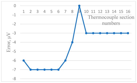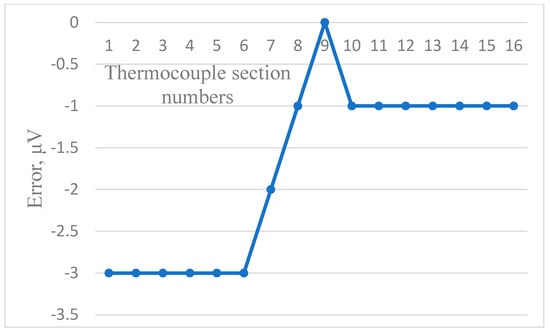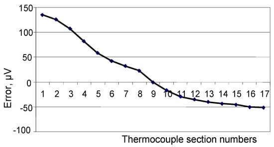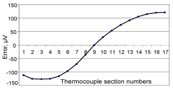 Figure 6, Figure 7 and Figure 8 show the dependence of residual error due to inhomogeneity of the chromel and alumel legs of the MTC, as well as for the whole MTC, respectively. The maximum residual error can be computed in the same way as in Figure 3, Figure 4 and Figure 5. As can be seen from the figures, the maximum error due to inhomogeneity of the chromel, alumel legs and the whole MTC is 4, 3, and 7 μV, respectively. The latter value of thermal electromotive force corresponds to residual error due to inhomogeneity and is approximately equal to 0.18 °C for the TCTF.