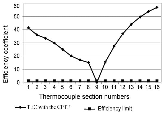 However, despite the high efficiency of compensation of MTC error due to acquired inhomogeneity in the composition of the TCTF, in a constant temperature field of the measurement object, this error is smaller for a conventional TC. This is because the error of controlling the temperature field in the TCTF is always present. Therefore, even with a strictly constant temperature field of the object, residual error due to inhomogeneity manifests itself. Therefore, it is reasonable to investigate the efficiency ratio of the TCTF to determine the conditions when it is reasonable to use it. The coefficient can be determined based on the ratio of errors of the conventional TC to error for the TCTF under the same changes in the temperature field of the object. Dependence versus change in the temperature field is shown in Figure 9. It can be seen from the figure that the TCTF provides high efficiency under considerable changes in the temperature field. The limit of the reasonability of use of the TCTF is the condition of . From Figure 9, it is difficult to determine the limit , so the corresponding limits are indicated in Table 1.