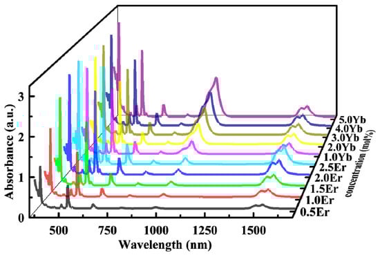 Figure 1 shows the absorption spectra of TBY glass doped with Er3+ or Er3+/Yb3+ in the visible and NIR regions. In the figure, zYb (z = 1, 2, 3, 4, 5) indicates the variation in the Yb2O3 concentration, while the Er2O3 concentration is 1.5 mol%. Here, it can be seen that in the wavelength range of 350–1700 nm, there are 10 absorption peaks, which are, respectively, 380, 407, 452, 488, 522, 544, 654, 800, 980, and 1532 nm. They are responsible for the transitions from the ground state level 4I15/2 to the excited state levels, which are 4G9/2, 2H9/2, 4F5/2, 4F7/2, 2H11/2, 4S3/2, 4I9/2, 4I11/2, and 4I13/2, respectively. Er3+/Yb3+ co-doped glass exhibits a wider absorption band in the range of 870–1060 nm compared to Er3+ single-doped glass, as the absorption cross-section of Yb3+ is about ten times larger than that of Er3+. This indicates that co-doped Yb3+ can effectively absorb 980 nm of pump light [37], which can be matched with commercial high-power LD lasers. Furthermore, according to the Mc-Cumber theory [38], the maximum absorption cross-section of TBY1.5Er absorption spectra at 977 nm is calculated to be 1.978 × 10−21 cm2, whereas the maximum absorption cross-section at 800 nm is only 1.124 × 10−21 cm2.