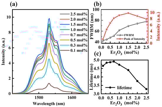 (a) NIR fluorescence spectra of different Er2O3 concentrations under 980 nm LD excitation; (b) FWHM and change in fluorescence peak under different Er2O3 concentrations; (c) relationship between Er2O3 concentration and lifetime.