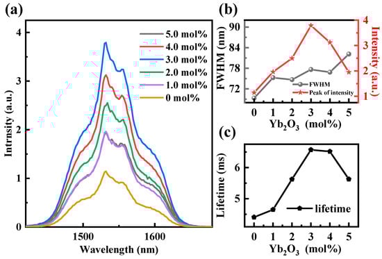Figure 4a illustrates the fluorescence intensities for various concentrations of Yb2O3 in the 1350 nm to 1700 nm range under 980 nm LD excitation, while maintaining a constant Er2O3 concentration of 1.5 mol%. As observed from Figure 4a, the fluorescence intensity initially increases with the rise in the Yb2O3 concentration up to 3 mol%. Beyond this concentration, however, the fluorescence intensity gradually decreases. Clearly, it can be seen that there is a significant increase in the fluorescence intensity with the addition of Yb3+ to TBYE. When the Yb2O3 concentration increases to 3 mol%, the fluorescence intensity increases approximately 3.3-fold compared to that of TBY1.5E, indicating an effective energy transfer between Er3+ and Yb3+ ions. Figure 4b illustrates the variation in FWHM with the gradient of the Yb2O3 concentration. It is evident that the FWHM exhibits non-uniform broadening as the Yb2O3 concentration increases, ranging from 69.3 nm at 0 mol% Yb2O3 to 82.4 nm at 5 mol% Yb2O3. This is because the continuous doping of Yb3+ induces more changes in dopant sites and ligand fields within the TBYE glass frameworks. The distribution of Er3+ at various doping sites is enhanced due to the strong ionic similarity between Er3+ and Yb3+ [24]. Figure 4c shows the fluorescence lifetime for various concentrations of Yb2O3 while maintaining the Er2O3 concentration at a constant 1.5 mol%. As seen in Figure 3, the fluorescence lifetime increases from 4.4 ms to 6.57 ms as the Yb2O3 concentration increases up to 3 mol%, and then decreases with further increases in the Yb2O3 concentration. The enhancement of the fluorescence intensity and lifetime with Yb3+ doping primarily stems from the continuous decrease in the distance between Er3+ and Yb3+ ions, leading to an increased probability of ET (Yb3+:2F5/2→Er3+:4I11/2). This increases the population of Er3+ ions at the 4I13/2 energy level and enhances emissions at 1532 nm. With a further increase in the concentration of Yb2O3, the gradual decrease in the fluorescence intensity and lifetime at 1532 nm is primarily due to the ET between Yb3+ ions: Yb3+:2F5/2+ Yb3+:2F7/2→Yb3+:2F7/2+Yb3+:2F5/2, which results in the concentration quenching of Yb3+ [54]. From the above analysis, the optimum concentration of Yb2O3 is 3 mol%. By combining the optimal concentration of Er3+, the proposed optimal doping concentrations for TBY in this paper are Er2O3: 1.5 mol% and Yb2O3: 3 mol%.