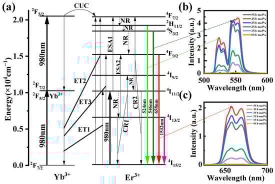 (a) ET diagram between Er3+, Yb3+; (b,c) Up-conversion spectra at different Yb2O3 concentrations.