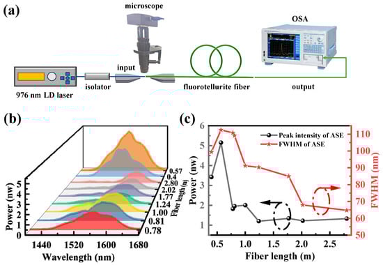 (a) Experimental setup for testing the ASE spectra of TBY fiber; (b) ASE spectrum of different fiber length; (c) ASE spectral FWHM and ASE spectral peak intensity of each fiber length.