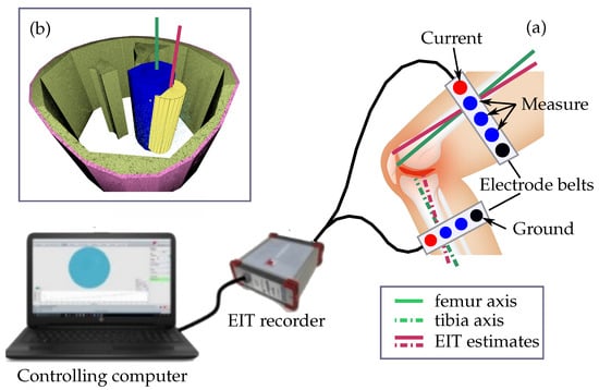 Electrical impedance tomography (EIT) is a non-invasive method which allows to capture the location and distribution of tissues inside the body [18,19]. The EIT images are generated by iteratively applying small currents ≤10 mA to the investigated object for example the thigh or lower limb and measuring the resulting potential difference observable at the measurement electrodes [20]. Figure 1 shows the envisioned configuration of an EIT system used to compute as accurate as possible estimates for the axis position and orientation of the femur and the tibia. The electrodes indicated by the red circles in Figure 1a are used to inject the currents and the blue ones are used to measure the voltage distribution resulting from the corresponding electrical field. The black electrodes symbolize the common ground electrode used for the current injection and measuring the voltage differences.