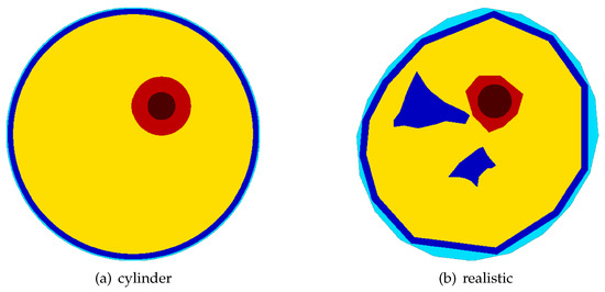 The two types of thigh models used: a simple cylindrical model (a) and a complex shape (b) mimicking a realistic cross section of the thigh. The cylinder model is used to validate the chosen approach, test the algorithm used to locate the bone axis, and verify the obtained results. The most complex models included the skin (light blue), fat (blue), cortical bone (red), bone marrow (dark red), and muscle (yellow).