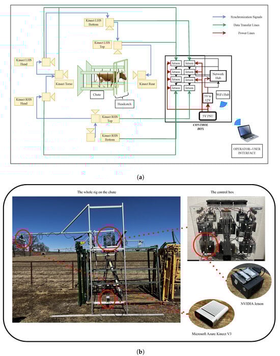 Figure 1 presents the platform used in our 3D cattle scanner. The frame is completely isolated from and mounted around the chute to prevent any disturbances due to the animals’ movements. A control box (Figure 1b) is responsible for controlling the cameras and taking images of the cattle which will be described in detail in what follows.