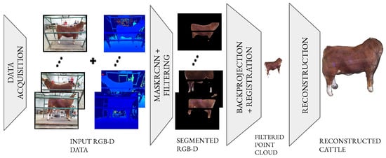 After segmentation, the 2D coordinates of the segmented object are backprojected into 3D space, resulting in a segmented point cloud for each sensor. These point clouds are then stitched/registered to construct a 3D model of the cattle as illustrated in Figure 5.
