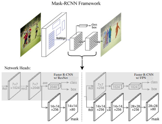 Mask R-CNN Architecture []: Mask R-CNN builds upon two existing Faster R-CNN heads as detailed in [,]. The left and right panels illustrate the heads for the ResNet C4 and FPN backbones, respectively, with an added mask branch. Spatial resolution and channels are indicated by the numbers, while arrows represent conv, deconv, or FC layers, inferred from the context (conv layers maintain spatial dimensions, whereas deconv layers increase them). All conv layers are 3 × 3, except for the output conv which is 1 × 1. Deconv layers are 2 × 2 with a stride of 2, and ReLU [] is used in hidden layers. On the left, ‘res5’ refers to the fifth stage of ResNet, which has been modified so that the first conv layer operates on a 7 × 7 RoI with a stride of 1 (instead of 14 × 14 with a stride of 2 as in []). On the right, ‘×4’ indicates a stack of four consecutive conv layers.