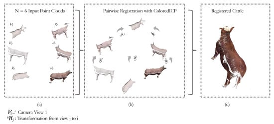 Multi-view point cloud registration: (a) Given N = 6 point clouds, we perform a simple pairwise registration of point cloud fragments of the scanned cattle. (b) We use the Colored ICP algorithm to solve for the coordinate transformation from camera coordinate frame j to camera coordinate frame i (denoted as ). Each view is aligned into the coordinate frame of its adjacent camera. We fix the coordinate frame of Camera 1 () as the world coordinate frame and then align all views with respect to coordinate frame 1. (c) This results in a well-aligned point cloud of the scanned cattle.