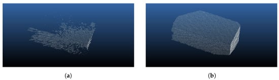 Comparison of 3D point cloud capture quality with and without synchronization using a large box with known dimensions. The left image displays the results without synchronization (0 μs), capturing a total of 17,098 points. The right image shows the same box captured with synchronization (160 μs) with all other settings the same, resulting in a total of 38,631 points, illustrating the significant improvement in data acquisition quality. (a) Large box, 0 s delay, n = 17,098. (b) Large box, 160 μs delay, n = 38,631.