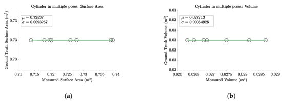 Results of scanning a cylindrical object in multiple orientations, highlighting the scanner’s accuracy across diverse poses. The horizontal axis displays the predicted volumes and surface areas obtained in each test. Given that the same object was used throughout, the ground truth volume and surface area remain constant. This plot demonstrates the scanner’s precision, as evidenced by the close alignment of the predicted values with the consistent ground truths, illustrating the system’s reliability in varying orientations. (a) Surface area calculation results. (b) Volume calculation results.