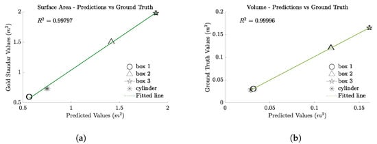 Regression analysis of predicted versus known surface area and volume for multiple static objects. The plots displays the correlation between the scanner’s predicted values and the actual measurements for a cylinder, small box, medium box, and large box, all placed in the same pose across 10 consecutive scans. The high values of 0.997 for surface area and 0.999 for volume demonstrate the scanner’s accuracy and consistency in various object dimensions and shapes under controlled conditions. (a) Surface area calculation results. (b) Volume calculation results.
