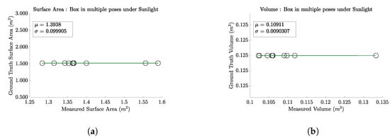 Performance of the scanner under direct sunlight, using a standard box to simulate outdoor livestock scanning conditions. The graphs show the mean and standard deviation of volume and surface area measurements across 10 consecutive scans. The results here illustrate the slight impact of sunlight on the scanner’s infrared sensors, affecting measurement accuracy. (a) Surface area calculation results from data collected in sunlight. (b) Volume calculation results from data collected in sunlight.