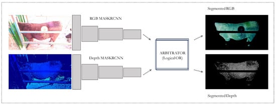 As indicated above, in the proposed approach, two separate Mask R-CNN networks were fine-tuned on two different input types using the same hand-labeled cattle dataset: RGB and depth. The final mask prediction is obtained by performing an OR operation on the masks generated by the two models. Formally, let be the mask predicted by the RGB model and be the mask predicted by the depth model. The final mask can be obtained as , where ∨ denotes the element-wise logical OR operation. This approach uses the complementary information provided by the RGB and depth images to improve the accuracy and robustness of the final segmentation mask.