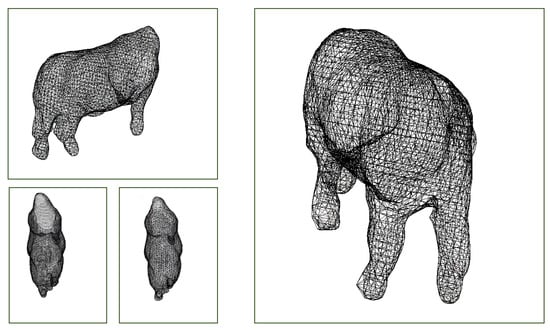 The pipeline concludes with a 3D surface reconstruction of the registered point cloud, facilitated by the Poisson Surface Reconstruction algorithm. As the name suggests, the Poisson Surface Reconstruction method aims to reconstruct a surface from a set of oriented points by computing an implicit function X that is 1 inside the surface and 0 outside. The actual surface is then reconstructed by extracting an appropriate isosurface. This is achieved by solving the Poisson equation , where V is a vector field derived from the normals of the oriented points, is the Laplacian operator, and ∇ is the gradient operator. This algorithm is designed to reconstruct a smooth, watertight surface from a disorganized collection of 3D points [,], enabling the system to extract any traits of interest. While our current application primarily focuses on measuring the volume and surface area of cattle, this stage of the pipeline is designed to be adaptable, accommodating the extraction of various phenotypes according to user specifications. The system’s flexibility here allows users to define and extract additional traits of interest, extending beyond the initial focus on volume and surface area. Thus, although we demonstrate the utility of this process through our specific measurements, the scanning system is broadly applicable and can be tailored to meet the diverse needs of its different users.