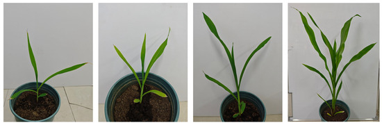 The data for this study were collected at the Experimental Building of the College of Information and Electrical Engineering, Heilongjiang Bayi Agricultural University, Daqing City, Heilongjiang Province, China (125°9′50″ E, 46°34′58″ N). In this study, maize was grown and tested indoors from seedling to tassel stage. The image acquisition device uses a Xiaomi 14 mobile phone with a 50-megapixel camera with an imaging resolution of 3072 × 4096, which is capable of capturing detail-rich images to ensure the accuracy and reliability of the data acquisition, as well as ensuring consistency in the exposure and color of images taken at different angles to minimize the impact of light and background variations on the experimental results. Therefore, the multi-angle acquisition of maize at different moments from 8:00 to 18:00 from seedling to tasseling stage helps to capture the changes in various stages of the maize growth process, effectively avoids fluctuations in image quality due to changes in light, and provides high-quality image information for subsequent data analysis and research. Data were collected at the same time throughout the study period using an illuminance meter to determine light intensity, as well as a multi-angle collection path and a fixed collection angle to ensure that the angle and distance were the same for each collection. A total of 1000 images were taken as the experimental dataset, light and color corrections were performed at the data processing stage to reduce data fluctuations caused by environmental factors, images were annotated using labeling software, unqualified sample images were strictly screened, and samples with poor quality due to inconsistent lighting or changes in environmental factors were excluded to ensure a high-quality dataset. After the data labeling was completed, 80% of the samples were randomly selected from the samples to construct the training set and 20% for the validation set, respectively [24]. This division ratio ensures that the model has enough samples for training and helps the model learn the data features better to avoid overfitting, and 20% of the data can effectively evaluate the model’s performance on unseen data to ensure that the model has a good generalization ability. The dataset includes two categories: maize and maize leaves. During the data labeling and segmentation process, the labels were carefully proofread to ensure the accuracy of the data. Some of the datasets used in this study are shown in Figure 1.