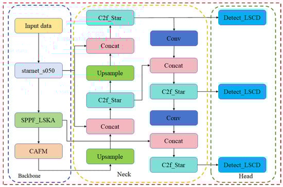 LCS-YOLOv8 model architecture. starnet_s050 replaces the YOLOv8 backbone network. LSKA improves the SPPF module. Adding the CAFM attention module to the backbone network. Improvement of C2f using modules in the StarNet network. Improvement of the detection head with the LSCD module.