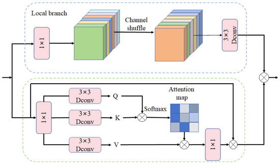 where Fconv is the output of the local branch, W1×1 denotes 1 × 1 convolution, W3×3×3 denotes 3 × 3 × 3 convolution, CS represents channel shuffle operation, and Y is the input feature. In the global branch, we first generate query(Q), key(K) and value (V) via 1 × 1 convolution and 3 × 3 depth-wise convolution, yielding three tensors with the shape of . The output Fatt of the global branch is defined as shown in Equation (2):