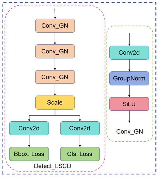 The raw detection header of YOLOv8 contains multiple detection layers, each of which has its own independent convolution operation for processing the input feature maps and generating the final detection results, which results in a large number of parameters and computation due to the independent convolution operation of each detection layer. Based on the above problems, a lightweight shared convolutional detection head (LSCD) is proposed, which effectively reduces the number of parameters and computational overheads by sharing convolutional layers. Detect_LSCD uses two shared convolutional layers to process the feature maps of all detection layers [33]. This sharing mechanism not only reduces the number of parameters in the model, but also improves the inference speed. Meanwhile, the multi-layer detection mechanism of YOLOv8 is retained, and each layer processes the feature map through specific convolutional and scaling layers to ensure the high accuracy of the detection. The structure of the Detect_LSCD network is shown in Figure 8.