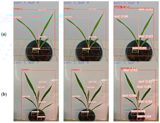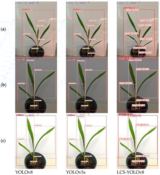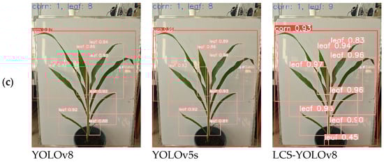 To verify the generalization of the proposed model for maize leaf detection at different growth periods. In this study, the leaf images of maize at the 4-leaf stage, 7-leaf stage and 9-leaf stage were randomly selected from the test set and input into YOLOv5s, YOLOv8n, and LCS-YOLOv8 for experiments, respectively, to observe the confidence situation, and the results of detection are shown in Figure 10. Among them, the confidence level of LCS-YOLOv8 for the leaf detection frames at 4-leaf stage and 7-leaf stage was around 0.9, which was improved compared to YOLOv8 and YOLOv5s; the confidence level of YOLOv5s was lower and there was a leakage of detection at the 7-leaf stage compared to LCS-YOLOv8 and YOLOv8 leaf detection frames. In the detection of leaf images at the 9-leaf stage, the LCS-YOLOv8 not only maintains high accuracy, but also has no leakage occurrence, and the YOLOv8 and YOLOv5s miss one leaf at the 9-leaf stage. Higher confidence in the detection frame indicates that the model has better captured the detailed features of the target during the learning process, and a higher likelihood that the target exists. Due to the continuous growth of maize leaves, the characteristics of cotyledons change considerably. As a result, YOLOv8 and YOLOv5s missed the yellowing cotyledons during detection. The LCS-YOLOv8 model embedded in the CAFM attention module proposed in this study can highlight important leaf information and improve the expression of different features, thus better capturing maize leaves. The experiments illustrate that the improved LCS-YOLOv8 has a better detection effect compared to the original YOLOv8 model, and this conclusion provides technical support for subsequent maize leaf number detection.