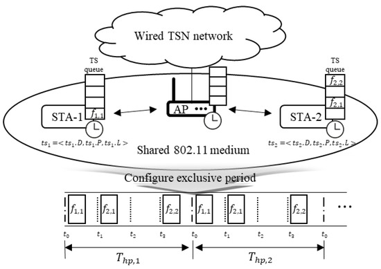 Applying TSN standard technologies to wireless systems based on the IEEE 802.11 standard involves more than just adopting the TAS algorithm. IEEE 802.11 fundamentally uses a carrier sense multiple access with collision avoidance (CSMA/CA) method for wireless medium access, where devices on the same channel compete for access based on random timing. This unpredictability in CSMA/CA makes it difficult to adhere to the TAS’s transmission gate on/off schedule [14]. Fortunately, the IEEE 802.11 standard also provides mechanisms under the control of the access point (AP) to manage the access times of the stations, allowing the timely transmission of TS streams if the WTSN system model is well-designed to meet TS streams requirements [15,16].